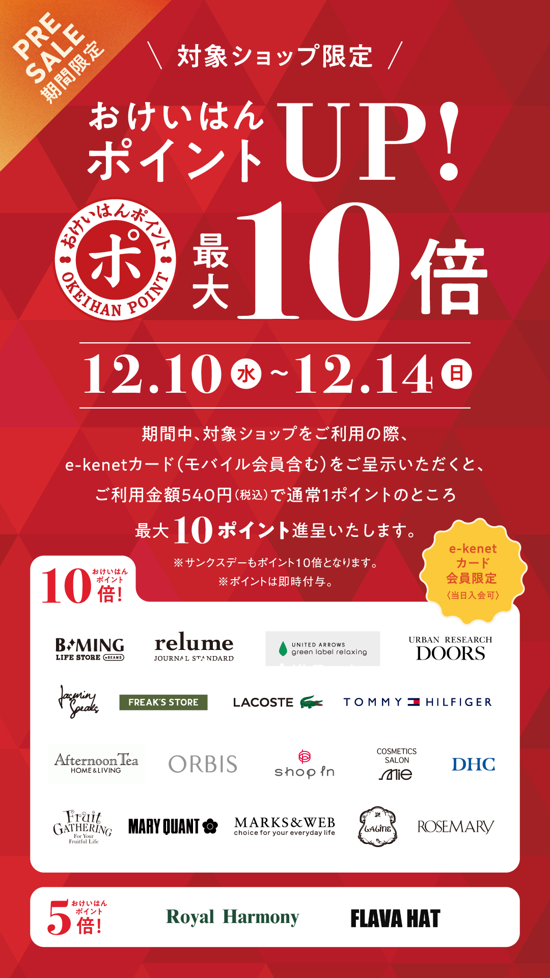 期間中、対象ショップをご利用の際、e-kenetカードをご呈示の上お買い上げいただくと、