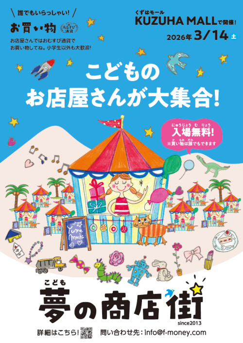 こども夢の商店街 開催期間 3月14日(土) 場所 KUZUHA MALL 館内各所 こどもたちがお店屋さんやハローワークでのオシゴトに参加して「おむすび通貨」を手に入れながら就業や就職を体験するイベント。会場には個性あふれるお店屋さんが並び、ハローワークでは、警察官、アナウンサーなど様々なオシゴトを選ぶことが出来ます。 【日 時】3月14日(土) 第 1 部 10:40-13:20/第 2 部 14:00-16:40 詳しくはこちら イベント一覧へ戻る