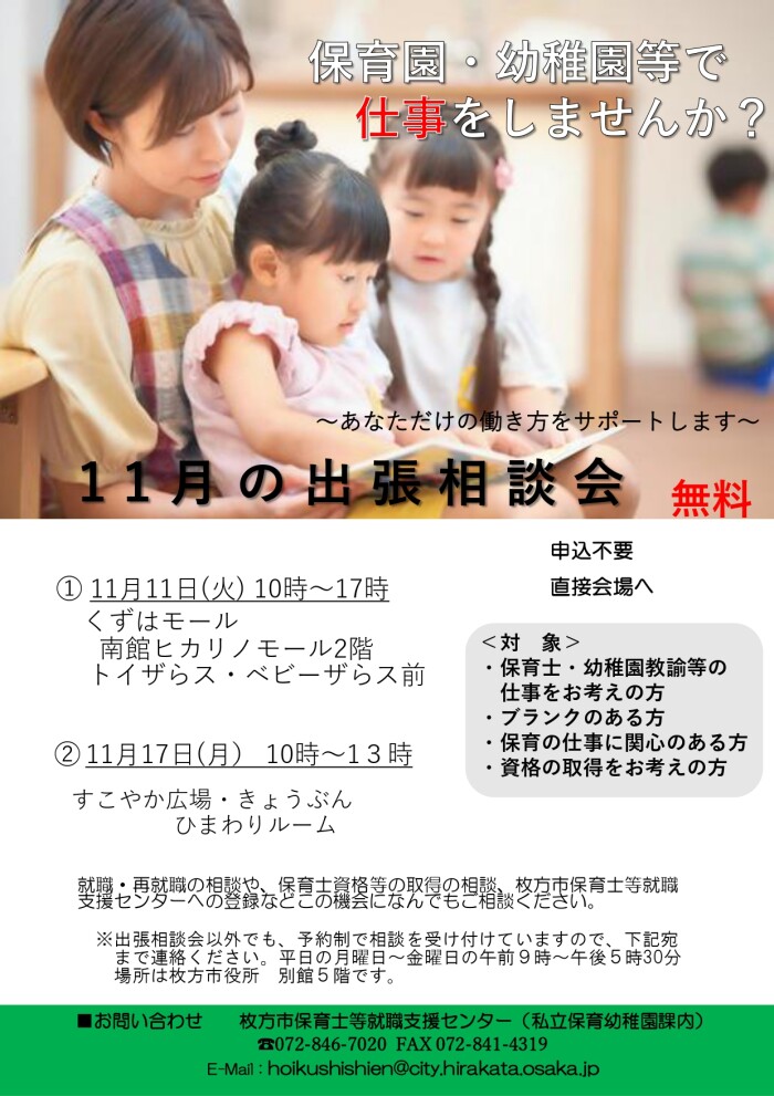 再就職や資格取得の相談、保育士等就職支援センターへの登録などができる出張相談会を開催します。登録者には希望勤務条件など相談の上、求人施設を紹介。対象は保育士資格などを持つ人や保育現場から一時離れていた人、資格取得を検討中など保育園・幼稚園などでの仕事に興味のある人。