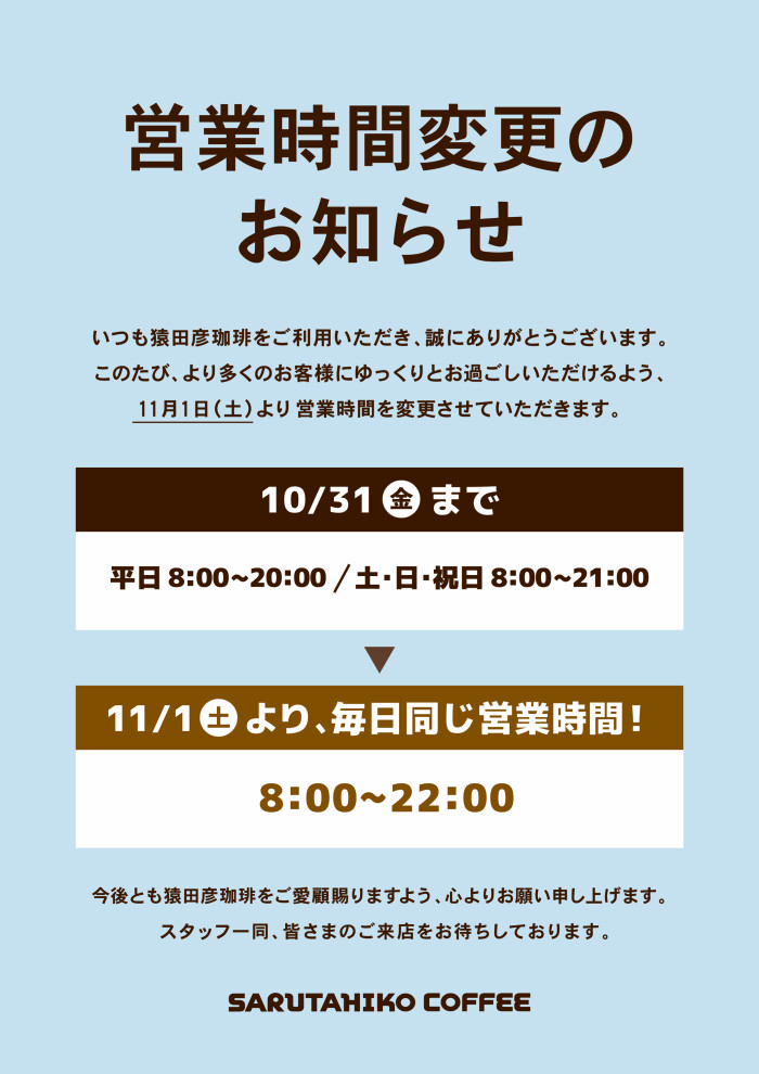 【猿田彦珈琲 くずはモール店 営業時間延長のお知らせ】