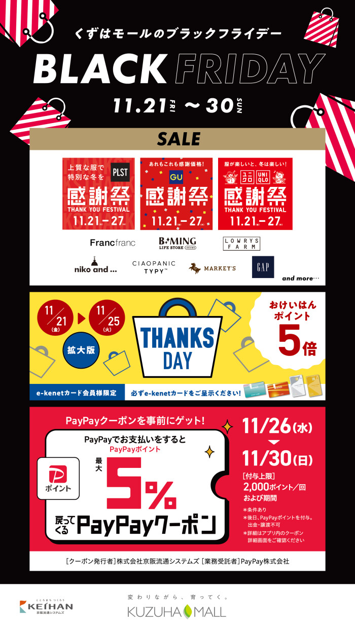 ブラックフライデー期間限定セールやおけいはんポイントが5倍のサンクスデー、対象店舗にてPayPayでお会計された方に5%のPayPayポイントが戻ってくるキャンペーンなどお得が詰まった10日間!