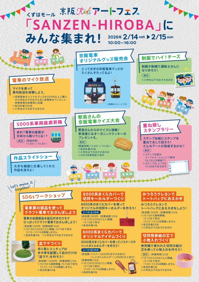 主なイベント:京阪電車オリジナルグッズ販売会、駅長さんの京阪電車クイズ大会、制服でハイ!チーズ!、SDGsワークショップ(切符用券紙の芯で小物入れ作り他)