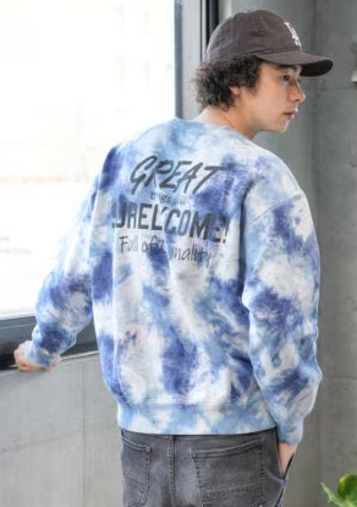 [1] トレンド感のあるダイダイ染めとロゴプリントを組み合わせた1枚で様になるスウェット